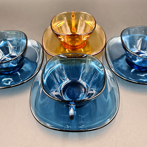 Mooie vintage set van 4 glazen kopjes met schotel van Vereco France, jaren 60.